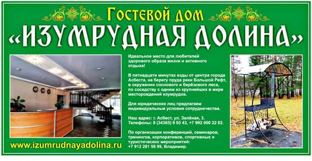 - До встречи в «Изумрудной долине»! Наш адрес: г. Асбест, ул. Зелёная, 3. Телефоны: 8 (34365) 9 93 43, +7 992 000 22 02. Сайт: www.izumrudnayadolina.ru